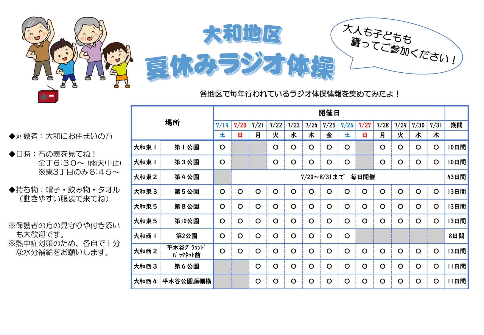 大和地区では毎年ラジオ体操が行われている丁がたくさんあります。