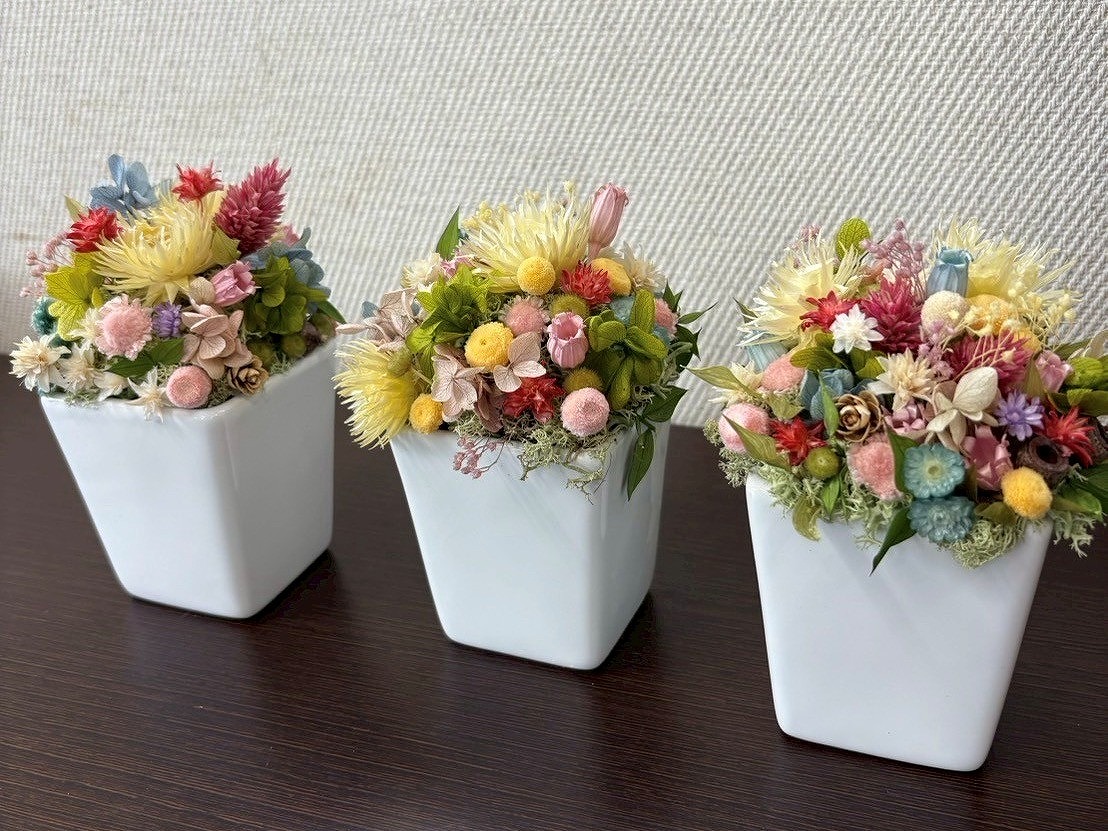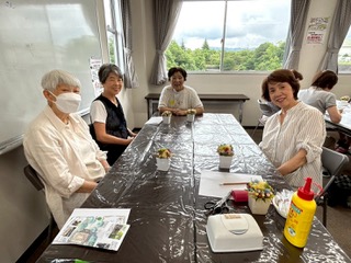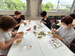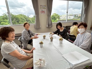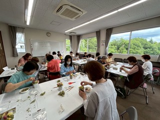 6月24日、講師の島村奈緒子さんのご指導で、カラフルな小花のドライフラワーをポットの上にギュッと挿すようにつけていくアレンジメント作りをしました。同じ花材でも完成した作品には参加者それぞれの個性が感じられました。皆さん無心になって作製し、出来上がった可愛らしいアレンジメントを見ると笑顔があふれていました。
