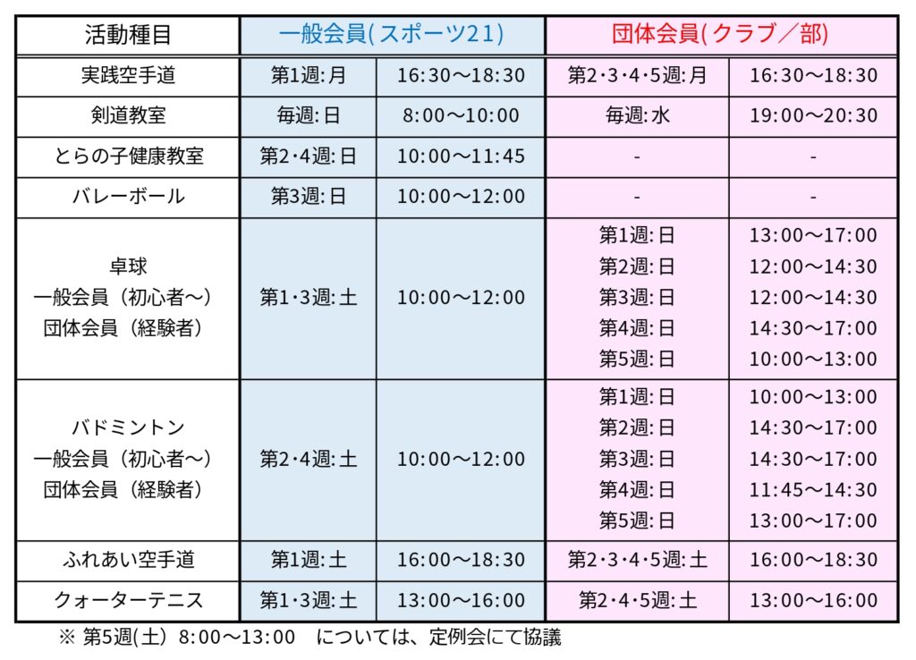 | 年会費 | ・会費や運用ルールは、クラブ毎に異なります。 ・団体会員の年会費には、スポーツ21の年会費を含んでいますので、一般会員の練習にも参加頂けます。 |