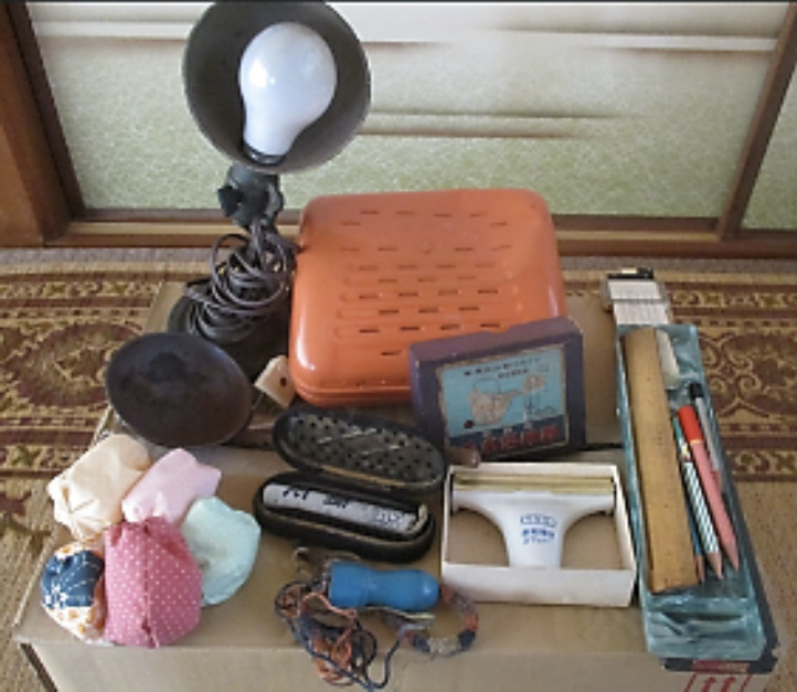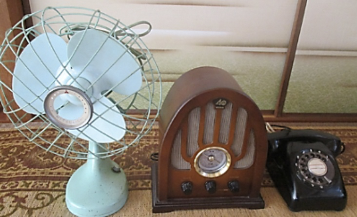黒電話、扇風機、肥後守、めんこ、豆炭あんか、お手玉、計算尺、ラジオなどを展示します。